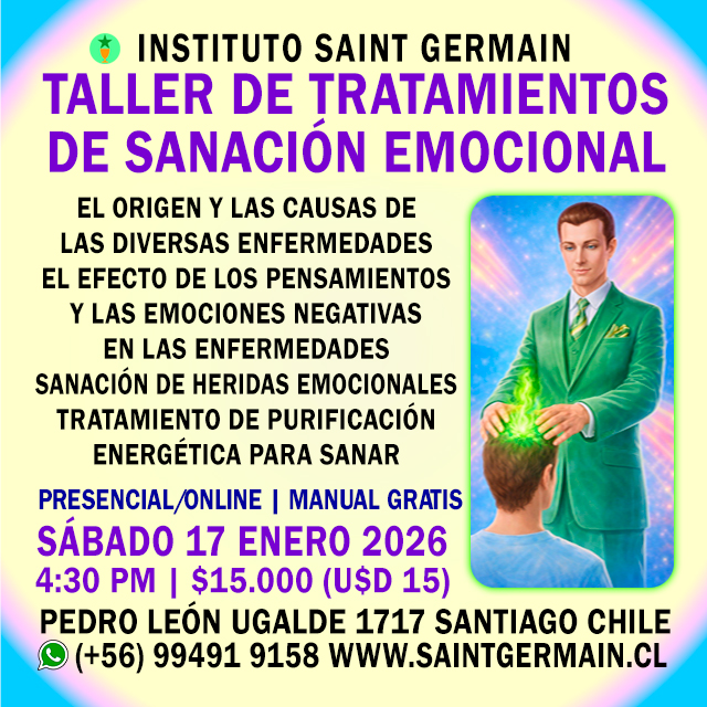 TALLER DE TRATAMIENTOS DE SANACIÓN EMOCIONAL |  Sábado 17 Enero 4:30 pm Santiago Chile | (+56) 99491 9158 |  www.saintgermain.cl